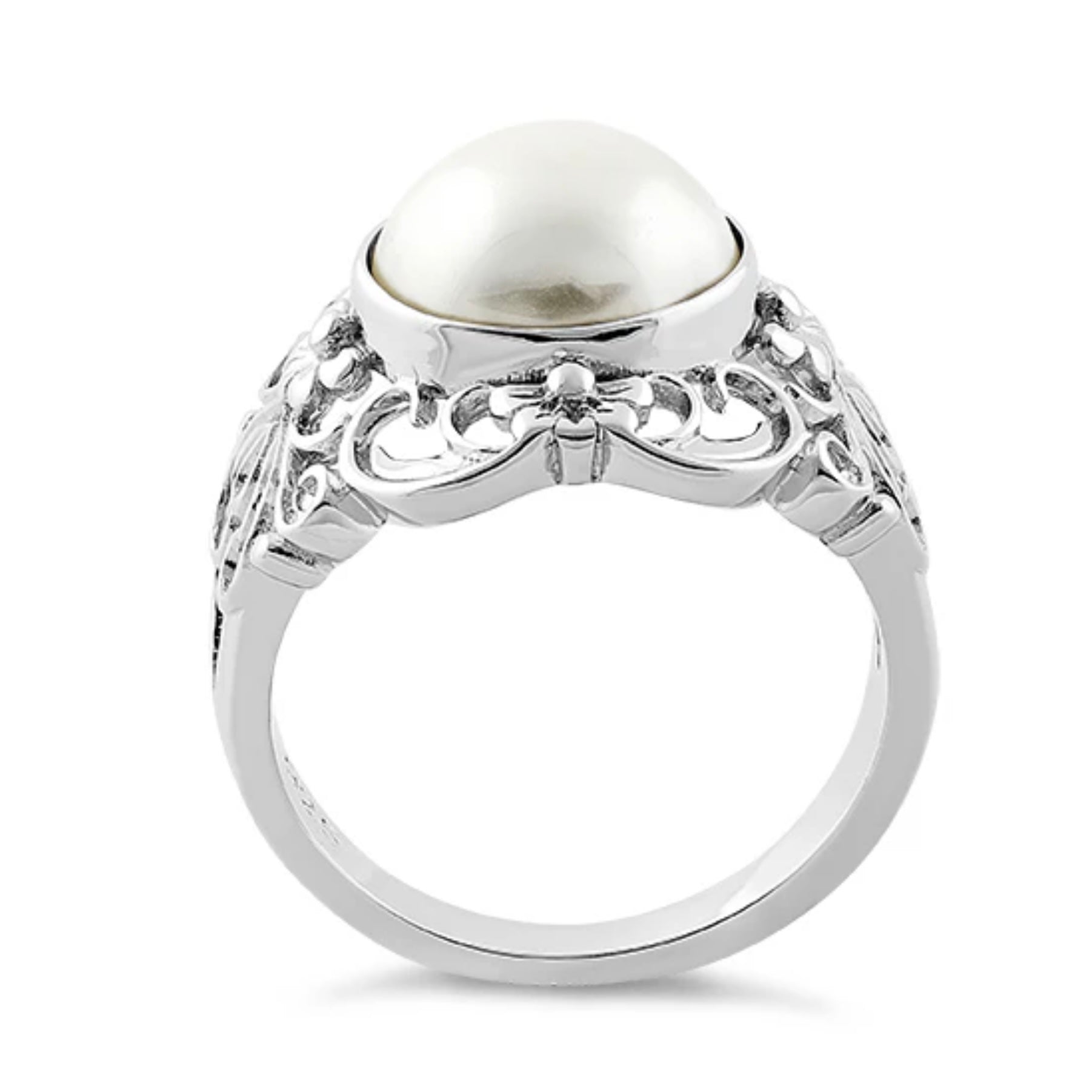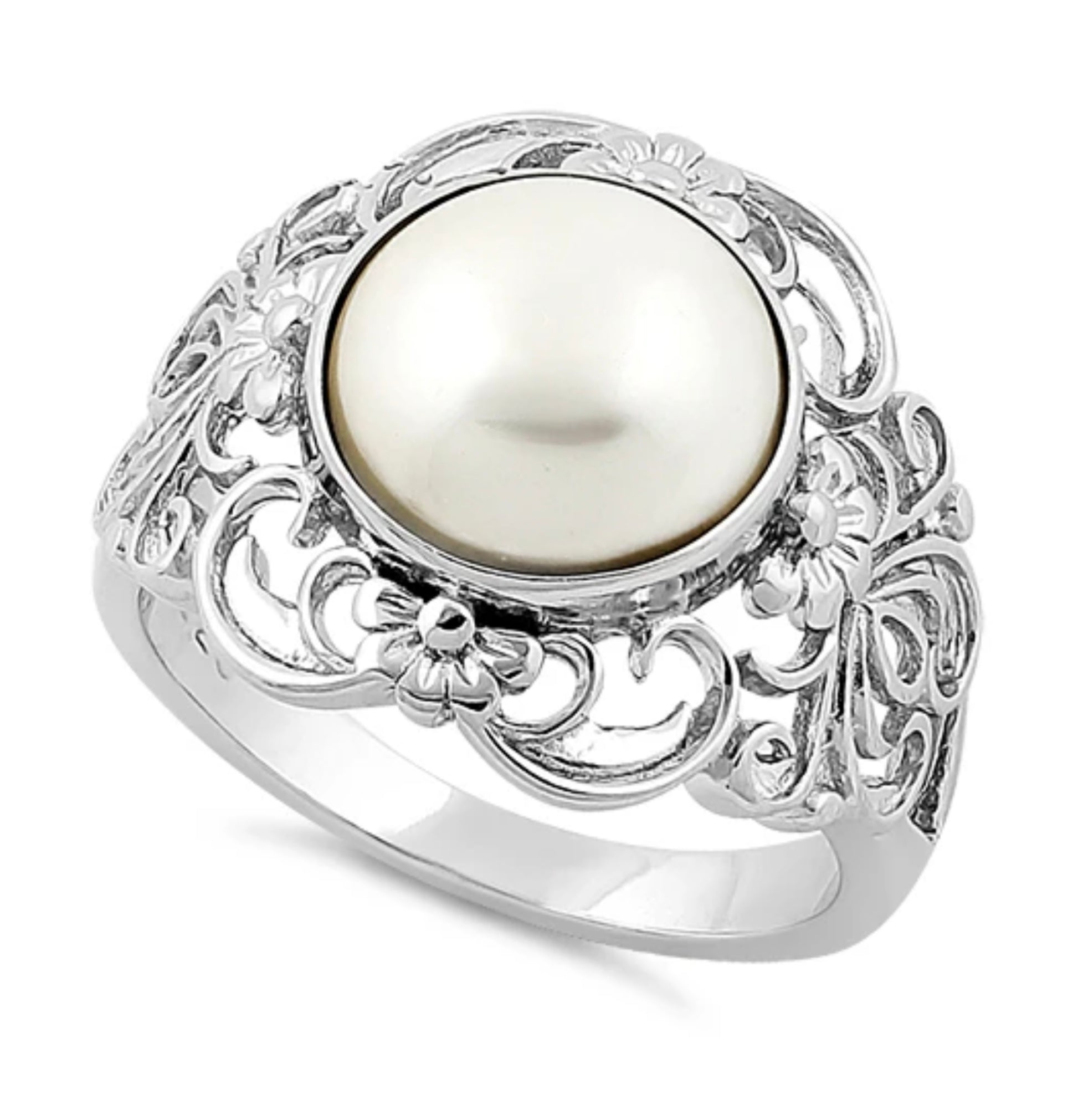 This elegant silver ring features a stunning pearl centerpiece, perfect for adding a touch of sophistication to any outfit.